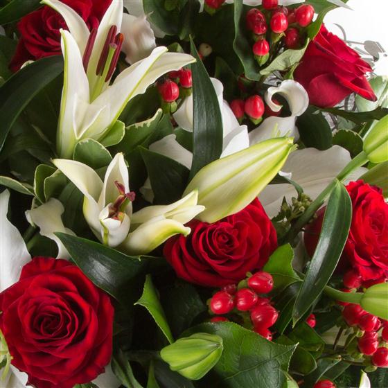 An beautiful display of highly fragranced white lilies and fabulous red roses mingled with a variety of foliage and berries.